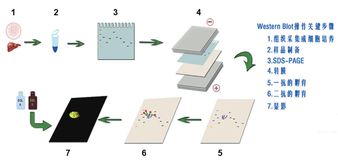 免疫印跡(Immunoblotting)又稱蛋白質印跡(Western Blot,WB),是一種綜合性的免疫學檢測技術。它利用SDS-PAGE技術將生物樣品中的蛋白質分子按分子量的大小在凝膠上分離開,然后用電轉移的方法將蛋白轉移到固相膜上,以固相膜上的蛋白質作為抗原,與對應的抗體起免疫反應,再與酶標記的第二抗體起反應,經(jīng)過底物顯色或熒光成像等方法以檢測電泳分離的特異性目的基因表達的蛋白質。WB技術現(xiàn)已廣泛應用于蛋白水平的表達研究、抗體活性檢測和疾病早期診斷等多個研究領域。